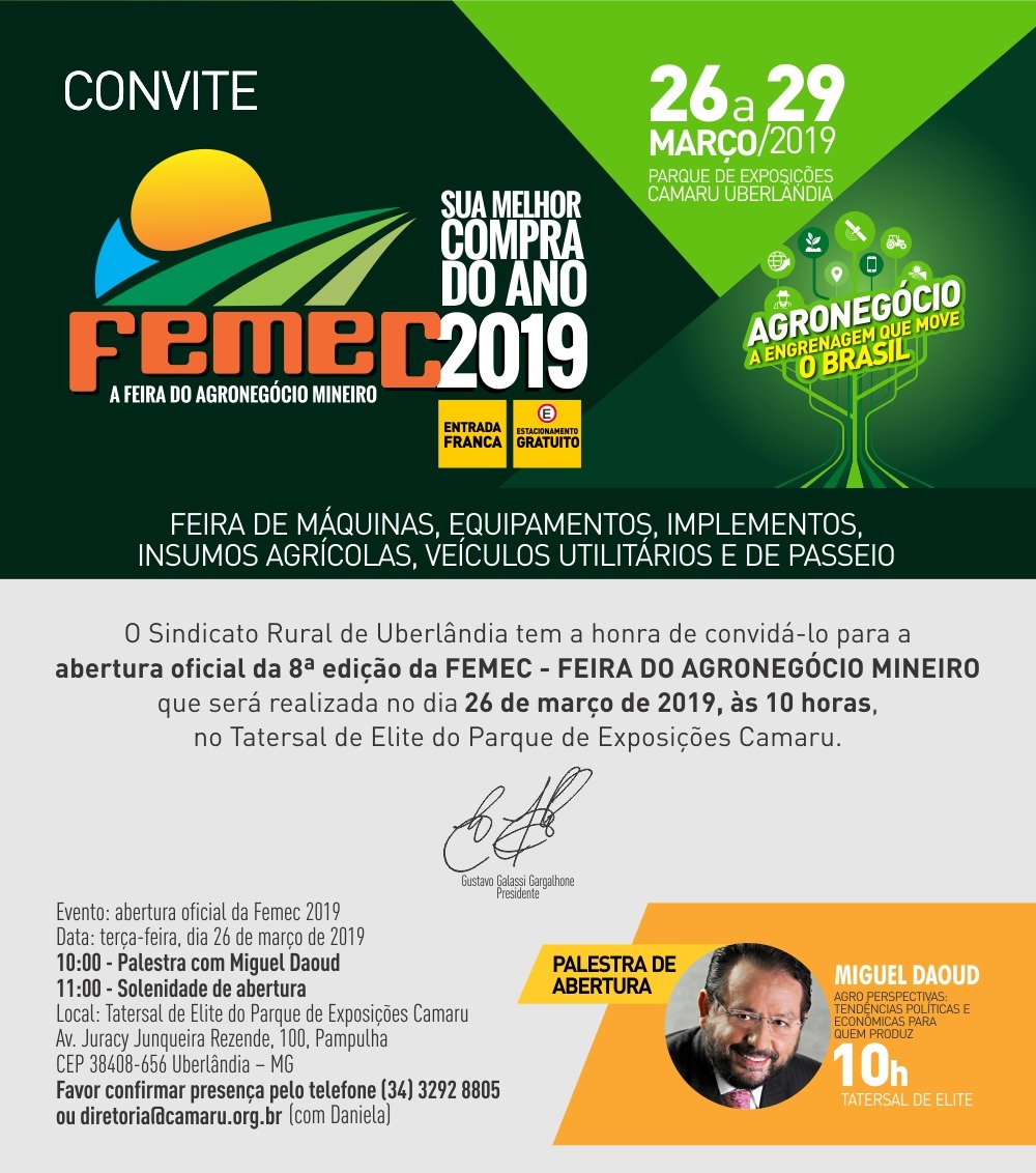 A abertura oficial da Femec 2019 acontecerá na próxima terça-feira, dia 26, a partir das 10 horas da manhã, no Tatersal de Elite do Parque de Exposições Camaru, em Uberlândia-Mg. O evento solene que marca o início da feira será às 11 horas com a presença do vice-governador de Minas Gerais, Paulo Brant, da secretária de Estado de Agricultura Pecuária e Abastecimento, Ana Valentini, e do prefeito de Uberlândia, Odelmo Leão. Os deputados estaduais Luiz Humberto Carneiro e Leonídio Bouças e o deputado federal, Zé Vitor, também confirmaram presença. A Femec 2019 é patrocinada pelo Sebrae.